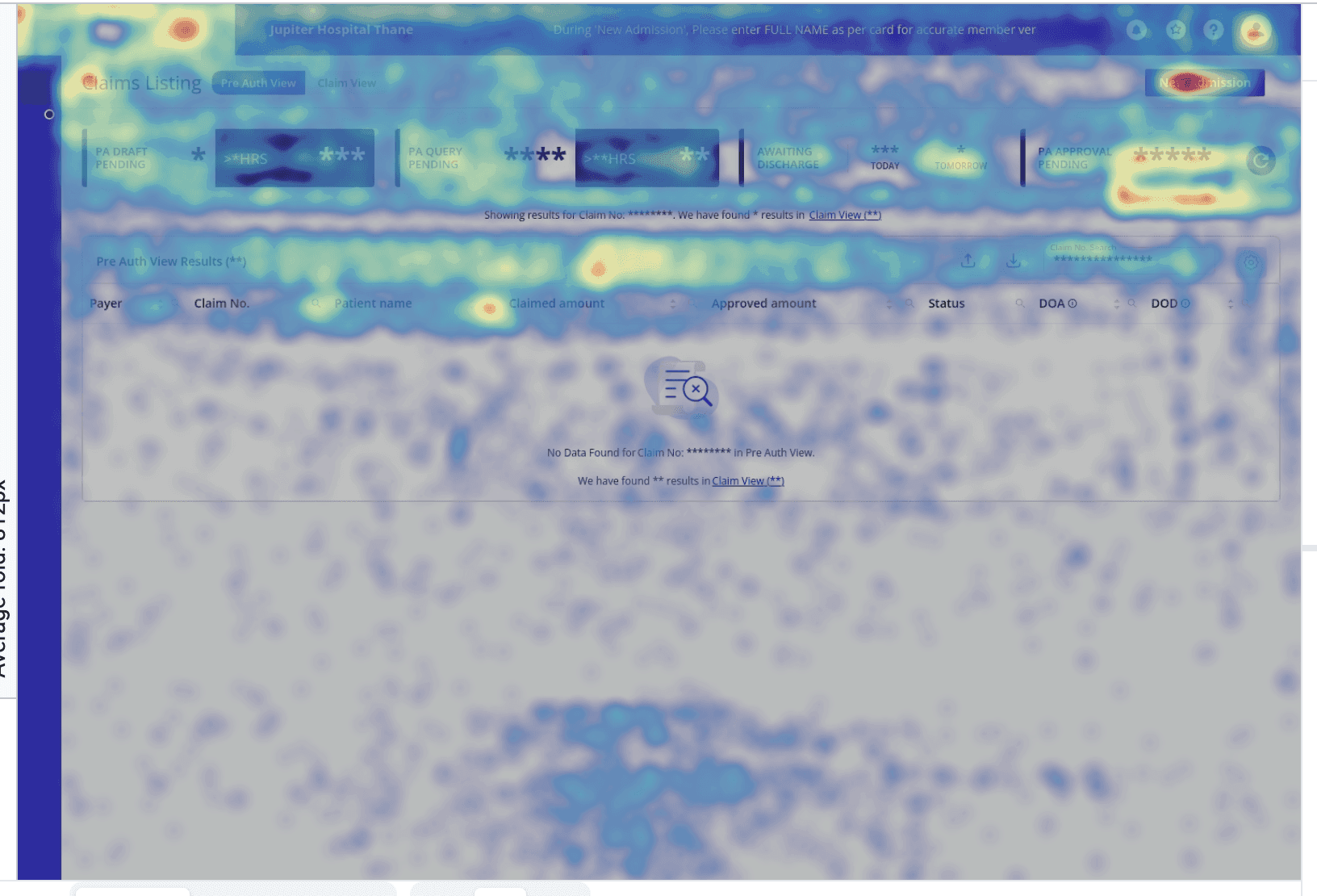 The heatmap showed heat concentrated at the top of the screen. New Admission, the search fields, and the Approval Pending bucket. The table body was cold. Users were not browsing. They were searching.
